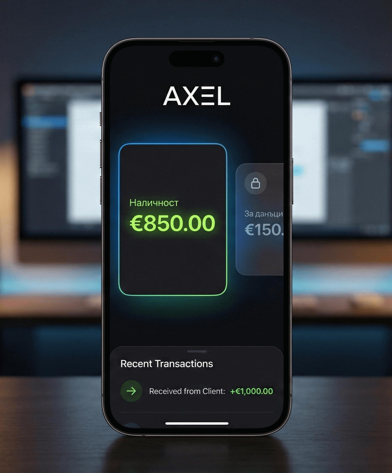 AXEL е първата сметка за фрийлансъри в България, която автоматично заделя данъците и осигуровките ти в момента, в който получиш плащане. Виждаш само парите, които са наистина твои.